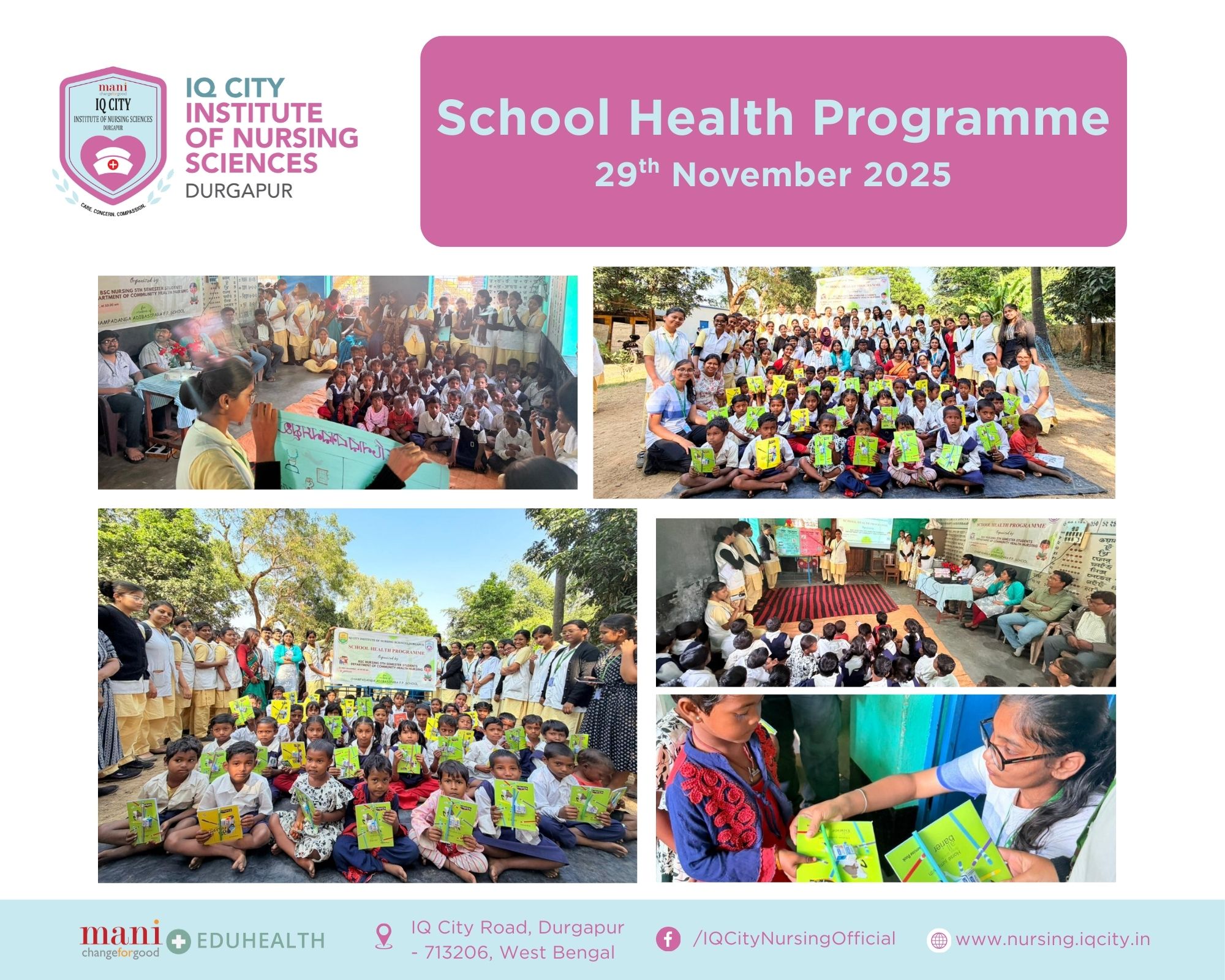 The School Health Programme was successfully conducted on 29th November 2025 at Champadanga Adivasipara F.P. School, Jemua, by the Department of Community Health Nursing and B.Sc. Nursing V Semester Students. The programme aimed to assess the health status of schoolchildren and promote awareness on personal hygiene, nutrition, and safety. A detailed health assessment was carried out by one PGT and two intern doctors from IQCMCH and also with the support of faculty and B.Sc. nursing V semester students. Health education sessions, role plays, and demonstrations were used to make learning interactive and effective. Educational materials and refreshments were distributed to students. The programme came to an end by 1pm.
